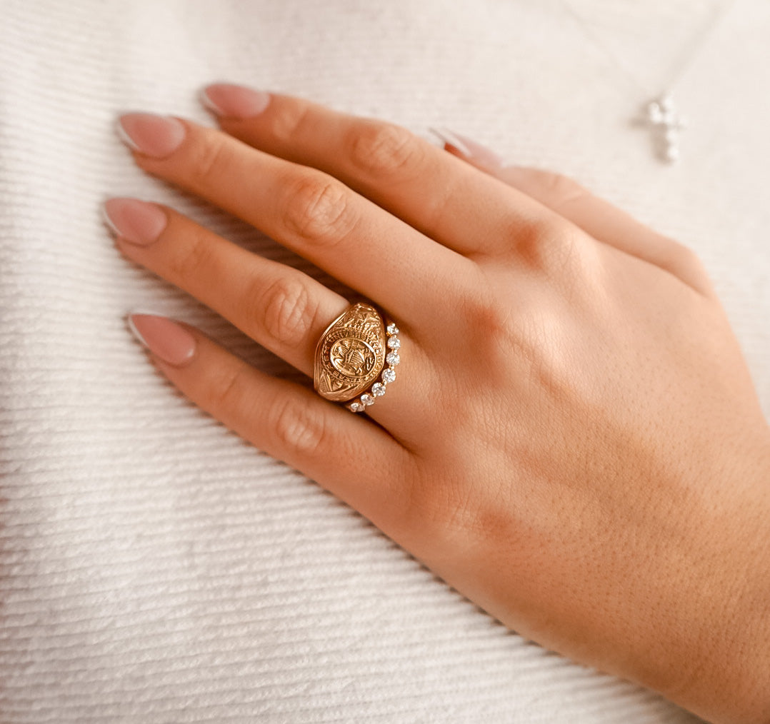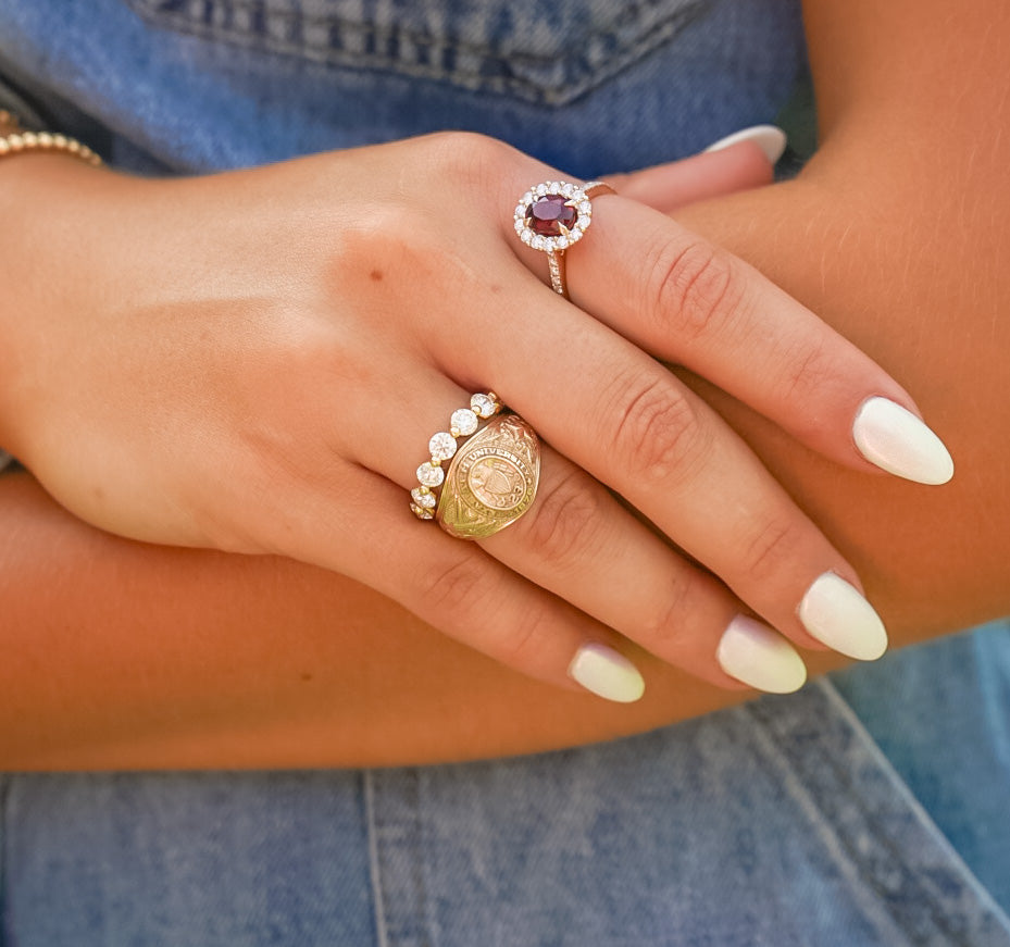 Elevate your class rings' brilliance with our Ring Guard Enhancers. offering versatile stackable options from sweet and simple to regal creations that pair perfectly with any set.